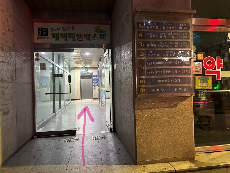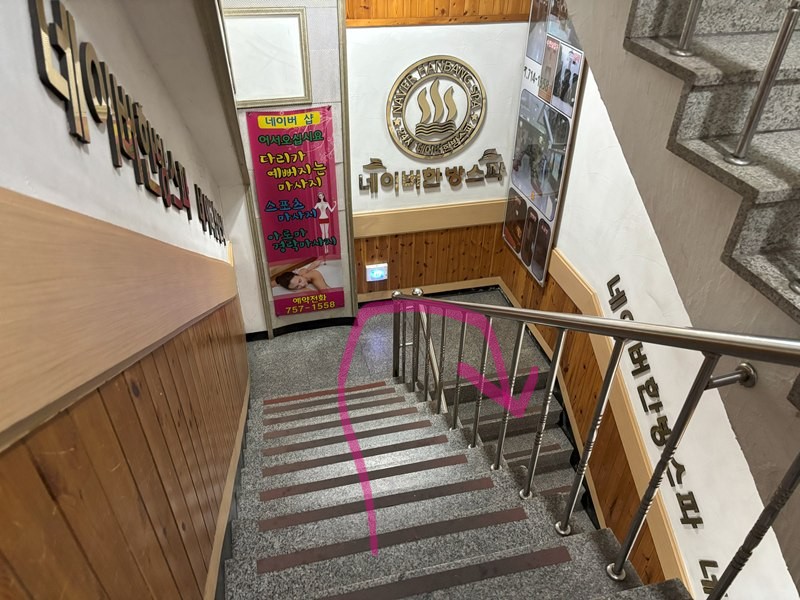 目的地の「ネイバー韓方サウナ」は、想像していたよりローカル感のある商業ビルの地下1階にありました。